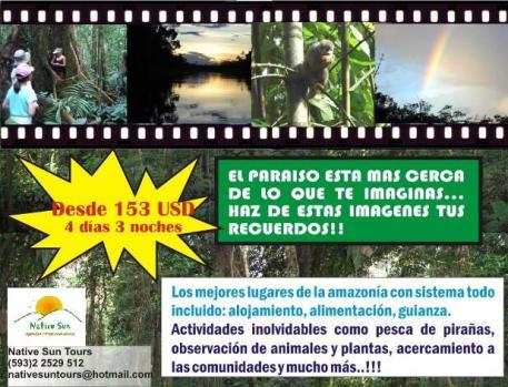 Los mejores lodges de la amazonia, en el cuyabeno, yasuni, misahualli y mas lugares paradisiacos. Programas todo incluido desde 153 dolares (incluido impuestos). Actividades inolvidables como pesca de pirañas, visita a comunidades amazonicas, observacion de aves, mamiferos, observacion nocturna de caimanes, torres altas. En fin relax total fuera de la ciudad. Oportunidad unica de conocer las maravillas de nuestro pais.