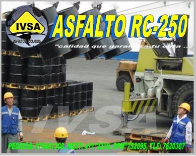 Ivsa Perú asfaltos es importante mencionar que todos los productos ofrecidos por ivsa Perú. Son de las mejores calidades tanto nacional como importado, con el objetivo de ofrecer al público usuario, seguridad, calidad y garantía. Brindamos los siguientes productos para ustedes: - asfalto rc 250 - petroleo industrial r- 500 - petroleo 6 - emulsión asfáltica lenta - emulsión asfáltica rápida - brea dura 160/180 - alquitrán (impermeabilizante) - asfalto mc 30 - pen 60/70 - cemento asfáltico 85/100 - mc 70 - rc 70 - otros. Enviamos en cisterna º de 3 000 mil galones º de 3365 tres mil trecientos sesenta y cinco galones º de 8 mil galones estamos en linea pedidos: nextel: 411*2239 telf: 01-7620307 cel: 975461308 rpm: *752095 asesor de venta: ronald villanueva.