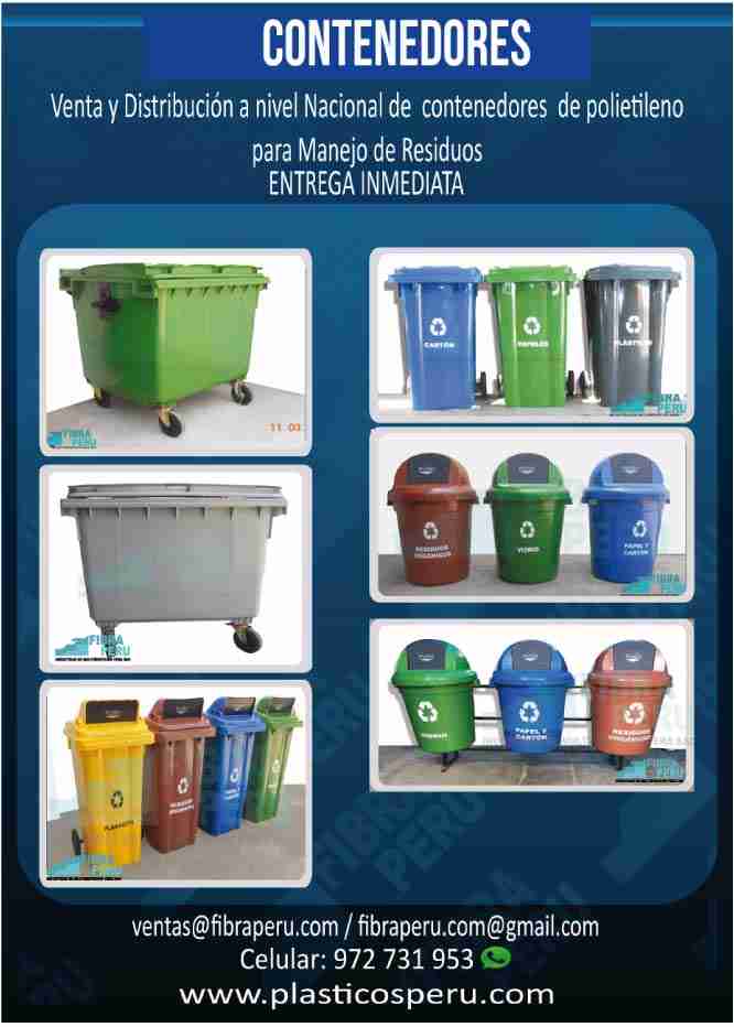 Contamos con contenedores de polietileno de alta densidad con aditivos anti uv. Contenedores 1, 100 lt. (verde y gris) contenedores 120 lt. Mod f9 (verde, gris y azul) contenedores 120 lt. Mod f3 (verde, amarillo, marrón y azul) contenedores 110 lt.(verde, marrón y azul) caracteristicas *resistentes al uso cotidiano. *material importado 100% virgen. *resistente al impacto. *resistente al calor y humedad. *resistente a las sustancias químicas. *resistente a la limpieza de alta presión. *fabricados según normativa din30700 / en 840. *certificación iso 14001. Entrega inmediata a Lima metropolitana y a nivel nacional. Estamos a su disposición en los siguientes correos y teléfono: cel: 972731953 tlf: 5330459 fibra Perú industrias de multiservicios vera s. A. C. Gracias.