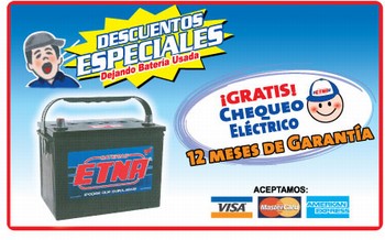 Distribuidor mayorista de baterias etna para todo tipo de autos distribuidor autorizado venta por mayor y menor ubiquenos en av garzon 1558 jesus maria telefono 3307391 celular 994509110 atencion de lunes a domingo 8am a 8pm precios de mayorista descuento por dejar bateria usado brindamos servicio electrico automotriz para todo tipo de vehiculo lo esperamos contactenos de lunes a domingo de 8 am a 8 pm telefono 3307391 celular 994509110.